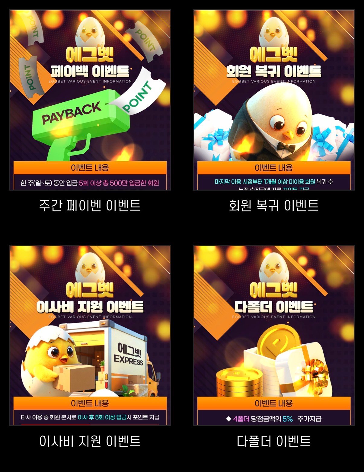 에그벳 사이트 첫충보너스에 다양한이벤트들도 있어서 좋아요 사이트에 이용할수있는 게임들도 많고 제 개인적으로는 배당이 좋아서 자주이용하는것 같아요 여기서 다들 사대한번 맞춰보세요~!