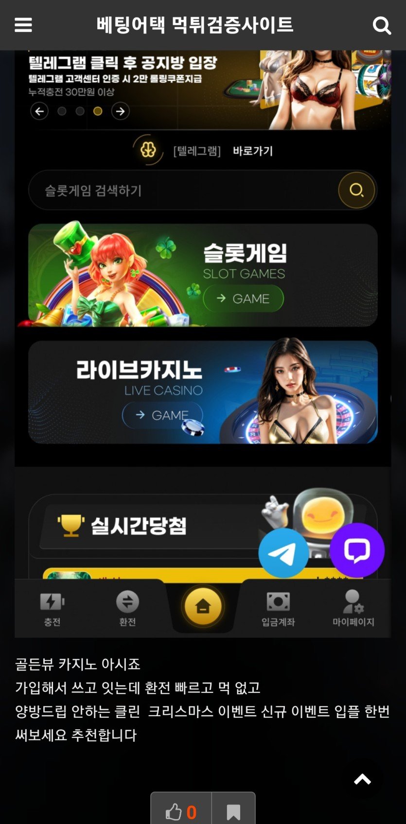 사이트가 깔끔하고 좋아요 혜택도 다양하고 무엇보다 입금처리가 엄청빨라서 좋습니다
