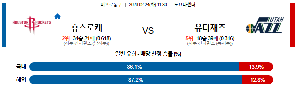 2026-02-24 11:30 NBA 휴스턴 로켓츠 vs 유타 재즈