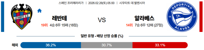알라베스의 역습 한두 번이 경기 흐름을 바꿀 여지는 있지만, 전체적인 후반 패턴과 수비 구조의 피로 누적을 감안하면, 막판으로 갈수록 레반테 쪽이 더 주도권을 강하게 쥐는 흐름이 자연스럽다.