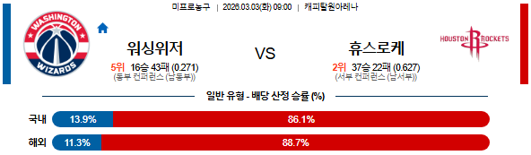 2026-03-03 09:00 NBA 워싱턴 위자드 vs 휴스턴 로켓츠
