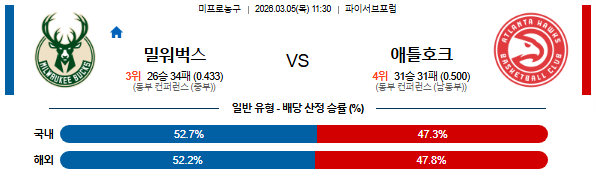 2026-03-05 11:30 NBA 밀워키 벅스 vs 애틀랜타 호크스
