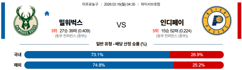 2026-03-16 04:30 NBA 밀워키 벅스 인디애나 페이서스