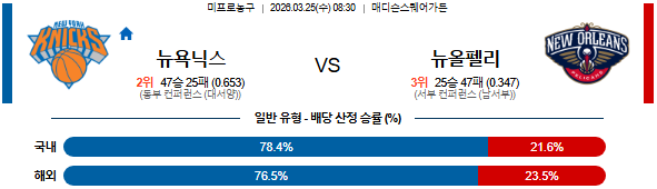 2026-03-25 08:30 NBA 뉴욕 닉스 vs 뉴올리언스 펠린컨즈