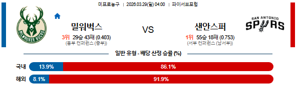2026-03-29 04:00 NBA 밀워키 벅스 vs 샌안토니오 스퍼스