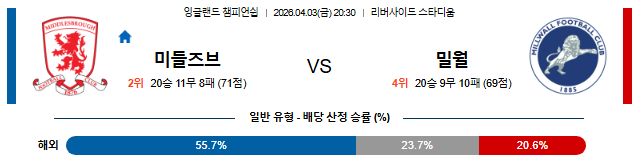 2026-04-03 20:30 잉글랜드 챔피언쉽 미들즈브러 FC vs 밀월 FC